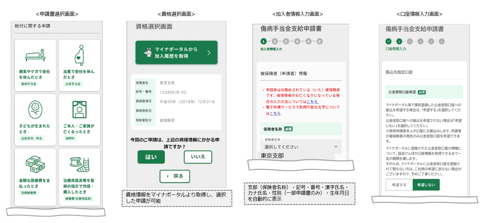 資料によれば、傷病手当金や出産手当金、出産育児金、高額療養費などの申請書が対象となっています。