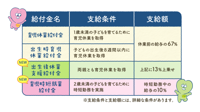育児休業等給付として、子の年齢や養育の状況に応じて、要件を満たす場合に「出生時育児休業給付金」、「育児休業給付金」、「出生後休業支援給付金」、「育児時短就業給付金」が支給されます。