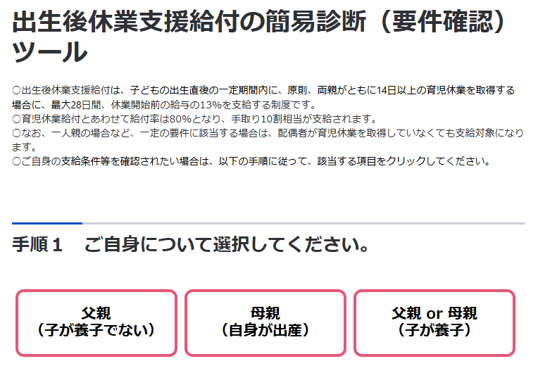 ご自身の出生後休業支援給付金の支給要件及び必要書類を確認できる診断ツールが公開されています。ぜひご活用ください。
