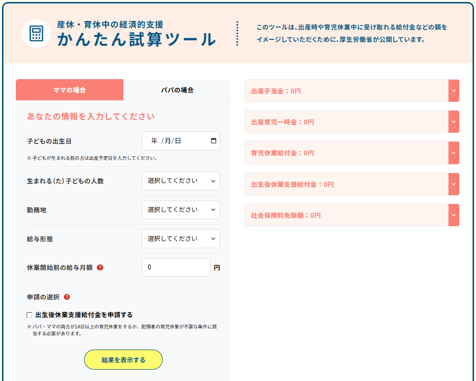 出産時や育児休業中に受け取れる給付金などの額をイメージしていただくために、試算ツールが公開されています。